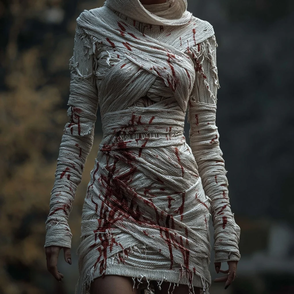 π©Έπ Get into the spooky spirit with this vintage bloody bandages sweater mini dressβcozy, chic, and perfect for Halloween festivities or casual autumn and winter days! π