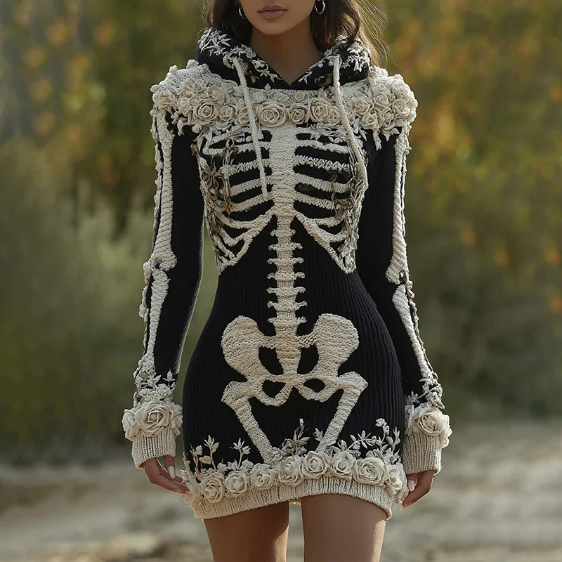 ππΉ Embrace spooky-chic comfort this Halloween with this cozy knit hooded sweater dress, featuring skeleton bones and rose art printsβperfect for casual daily wear or festive vibes! ππ€