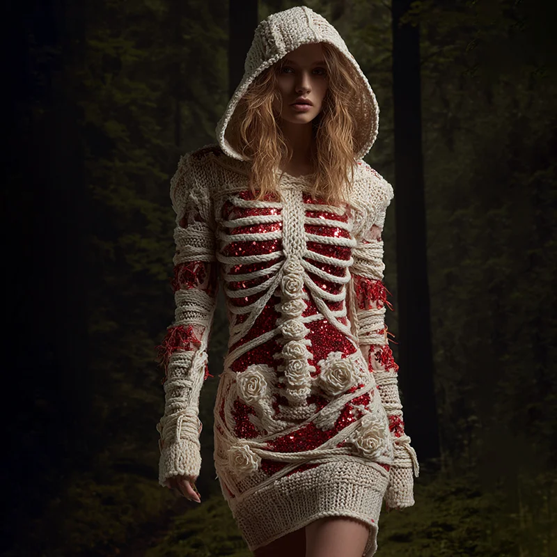 Women’s Halloween Anatomy Bandage Rose Sequin Art Cozy Knit Hooded Sweater Dress